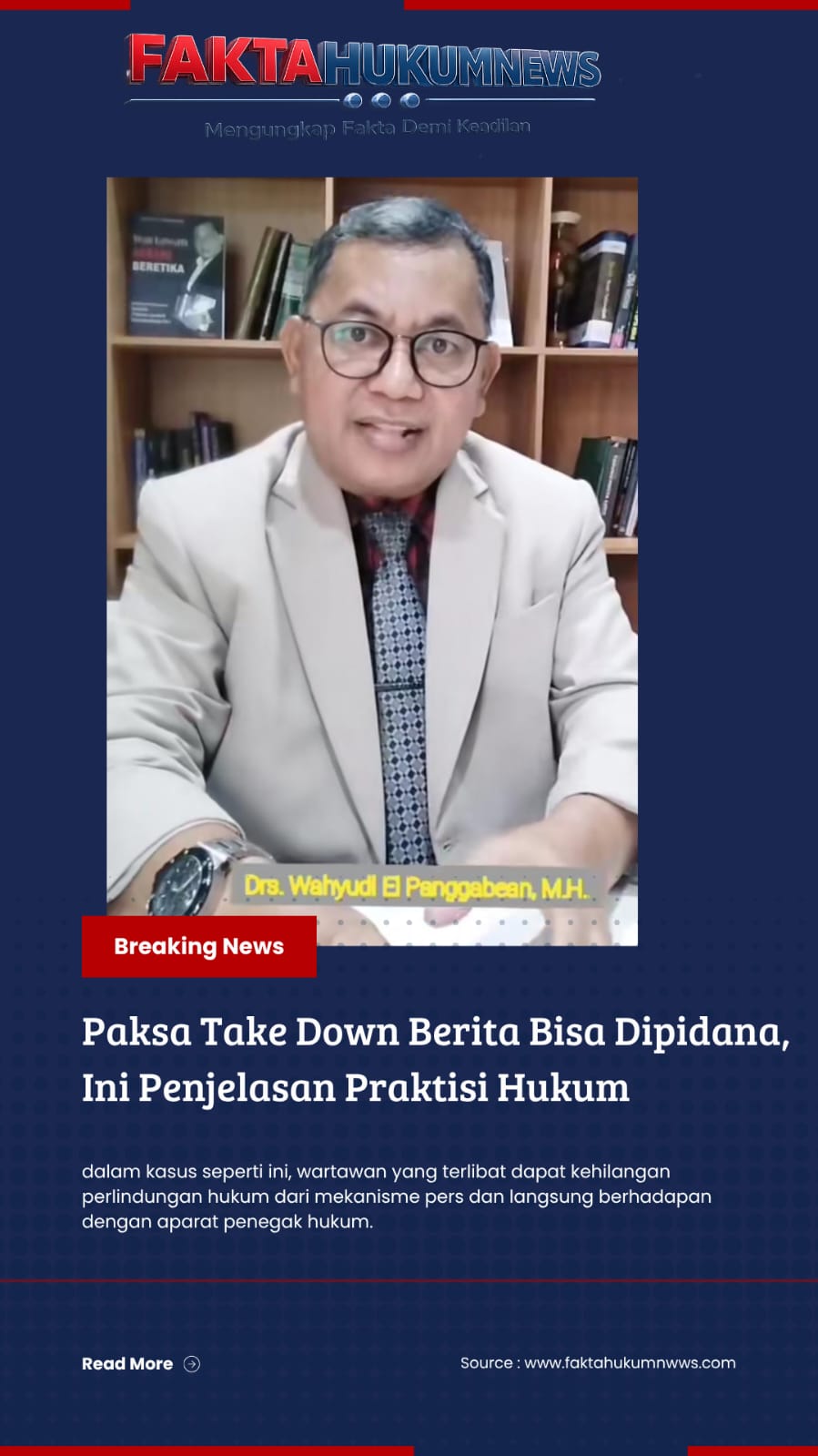 FAKTAHUKUMNEWS, Tangerang – Praktisi hukum dan pengamat jurnalistik sekaligus penulis dan wartawan senior, Drs.Wahyudi El Panggabean M.H, menegaskan bahwa tindakan memaksa wartawan untuk menghapus berita (take down) yang telah dipublikasikan merupakan perbuatan melawan hukum. Minggu (12/04/2026)