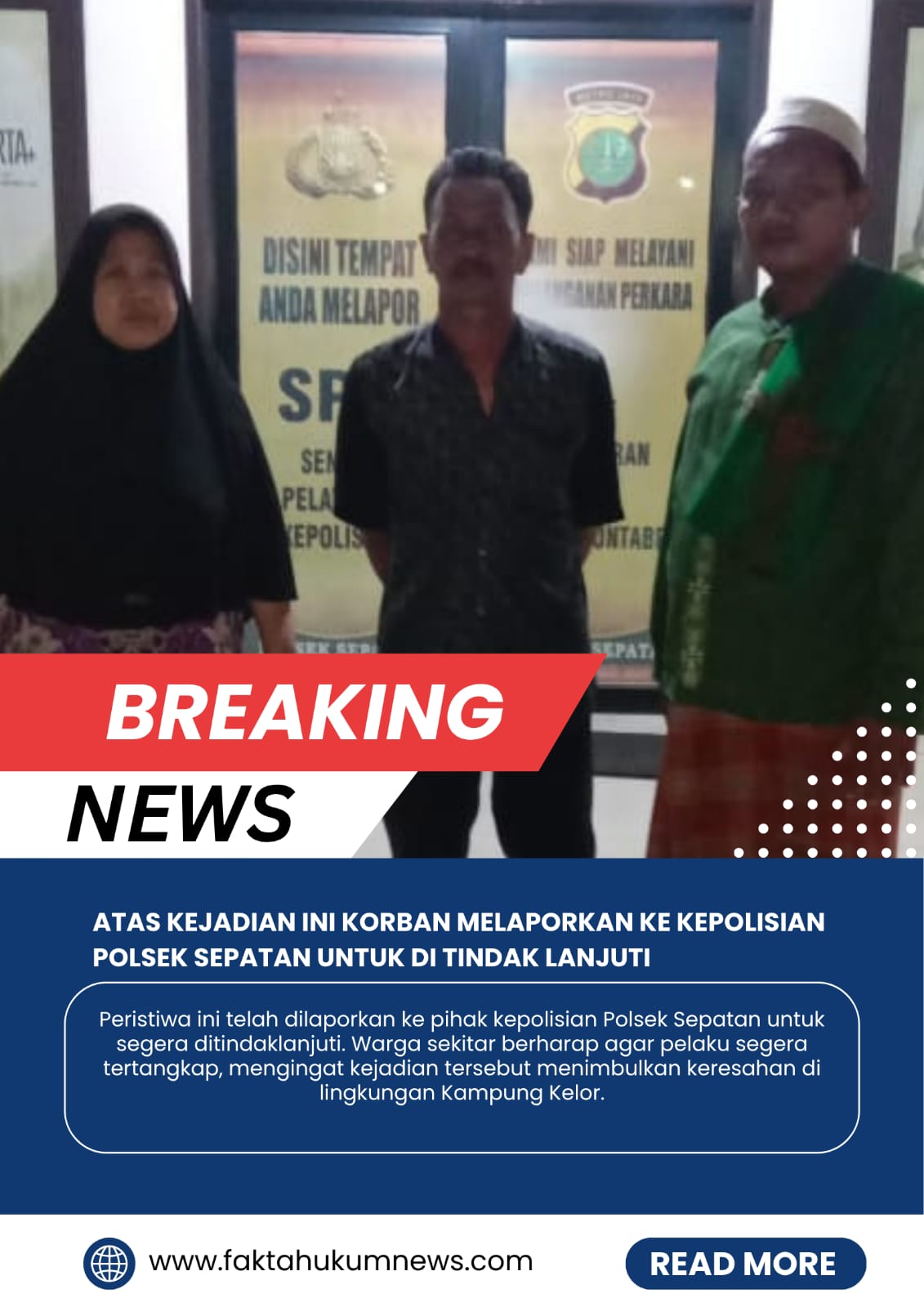 Peristiwa ini telah dilaporkan ke pihak kepolisian untuk segera ditindaklanjuti. Warga sekitar berharap agar pelaku segera tertangkap, mengingat kejadian tersebut menimbulkan keresahan di lingkungan Kampung Kelor.