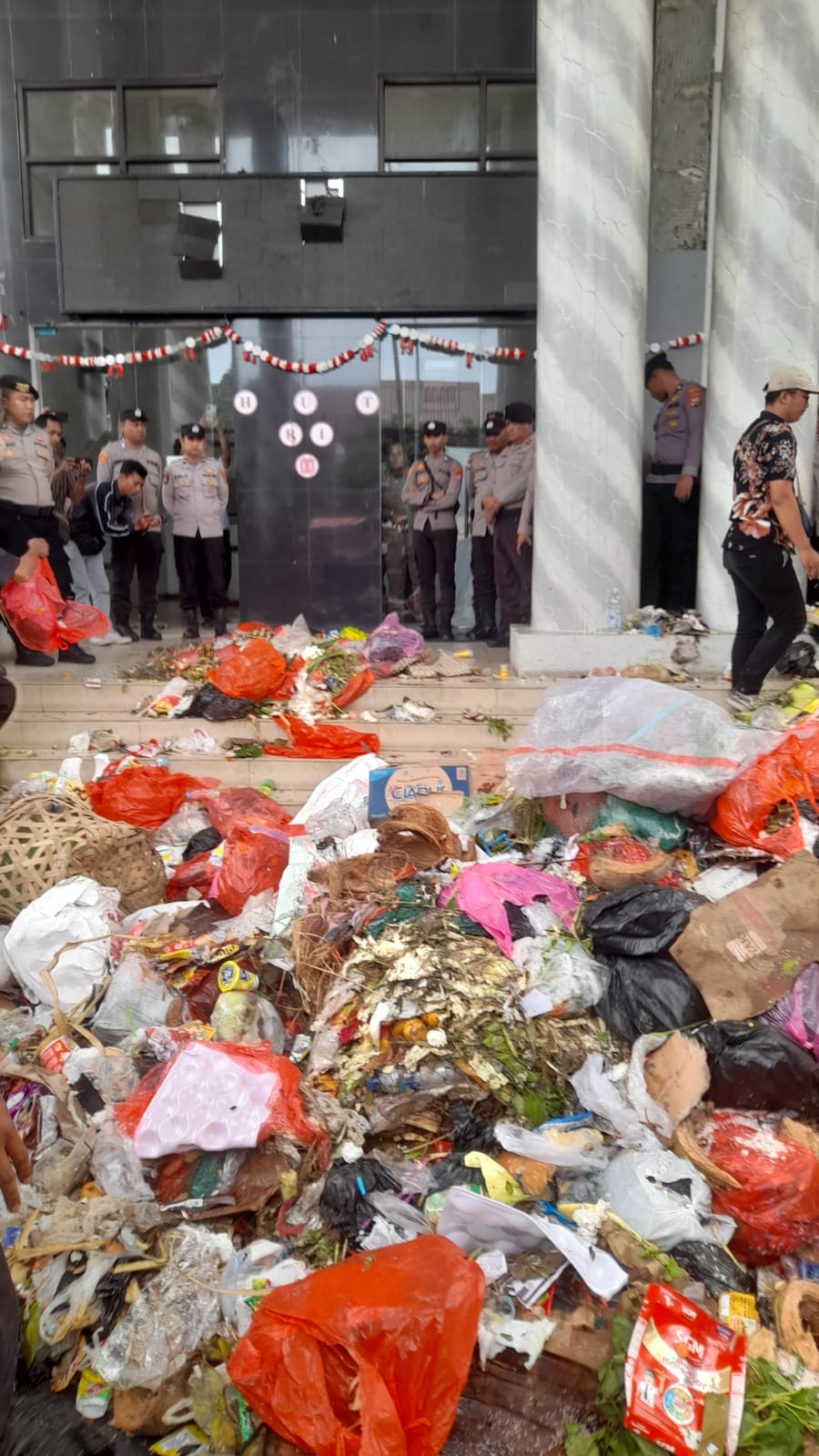 Dalam aksi tersebut, massa datang tidak hanya dengan teriakan lantang, tetapi juga membawa satu truk penuh sampah yang kemudian ditumpahkan tepat di depan Kantor Bupati Pandeglang. Bau busuk menyengat langsung memenuhi udara, menimbulkan suasana mencekam di sekitar area pemerintahan.