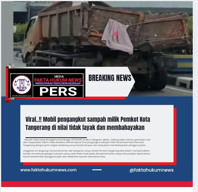 Kota Tangerang-faktahukumnews.com- Sebuah video yang diunggah pada Minggu (05/01/2025) di akun Instagram @Info_Ciledug telah memicu perhatian luas dari masyarakat. Dalam video tersebut, terlihat sebuah truk pengangkut sampah milik Pemerintah Kota (Pemkot) Tangerang dengan pintu bagian belakang yang tampak keropos dan berpotensi membahayakan pengguna jalan.