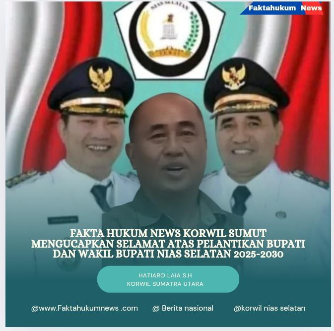mengucapkan selamat atas dilantiknya Bapak Sokhiatulo Laia sebagai Bupati Nias Selatan dan Bapak Ir. Yusuf Nache sebagai Wakil Bupati Nias Selatan periode 2025-2030.