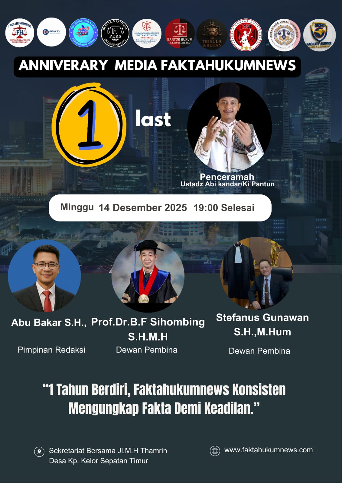 “Satu tahun ini menjadi bukti bahwa Faktahukumnews tetap konsisten mengungkap fakta demi keadilan. Kami berkomitmen menjaga independensi, profesionalisme dan integritas jurnalistik, dan terimakasih untuk semua pihak yang telah mensuport serta terus menjaga sinergitas bersama faktahukumnews,” ujar Abu Bakar.