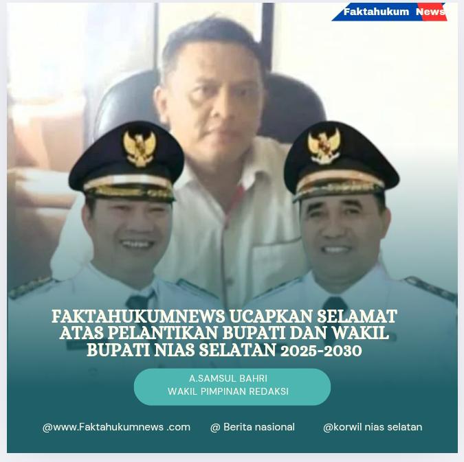 Nias Selatan – Jajaran staf redaksi FaktaHukumNews dengan penuh hormat dan kebanggaan mengucapkan selamat atas pelantikan Sokhiatulo Laia sebagai Bupati Nias Selatan dan Ir. Yusuf Nache sebagai Wakil Bupati Nias Selatan periode 2025-2030.
