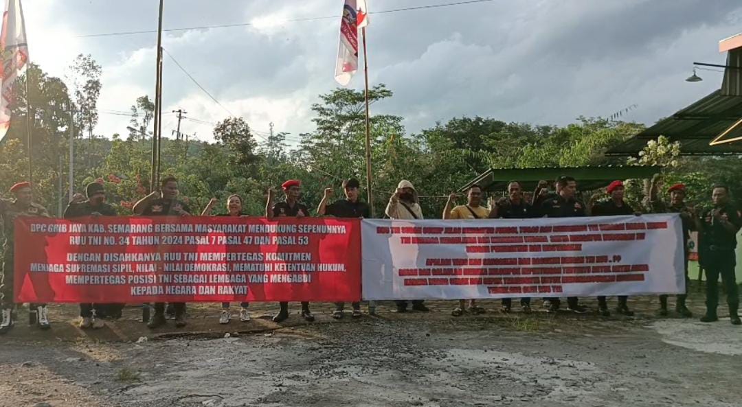 Fakta Hukum News,Semarang – Organisasi masyarakat (Ormas) Gerakan Rakyat Indonesia Bersatu (GRIB) Jaya Kabupaten Semarang menggelar aksi damai untuk mendukung pengesahan Undang-Undang Tentara Nasional Indonesia (UU TNI). Aksi ini berlangsung dari pukul 15.00 hingga 17.00 WIB di Jalan Salatiga-Bringin, tepatnya di sebelah Jembatan Karanglo, Desa Bringin, Kecamatan Bringin, Kabupaten Semarang Pada Sabtu, (29/3/2025).