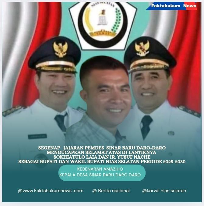 mengucapkan selamat atas dilantiknya Sokhiatulo Laia sebagai Bupati Nias Selatan dan Ir. Yusuf Nache sebagai Wakil Bupati Nias Selatan periode 2025-2030.
