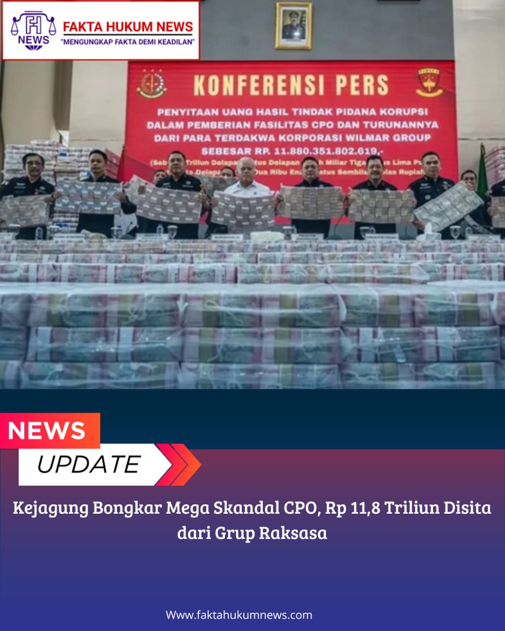 FaktaHukumNews, Jakarta – Kejaksaan Agung Republik Indonesia kembali menunjukkan ketegasannya dalam pemberantasan korupsi berskala besar. Melalui konferensi pers yang digelar di Gedung Pidana Khusus Kejagung, pihak penyidik resmi mengumumkan penyitaan dana fantastis senilai Rp 11,8 triliun yang dikembalikan oleh lima entitas korporasi di bawah naungan Wilmar Group.