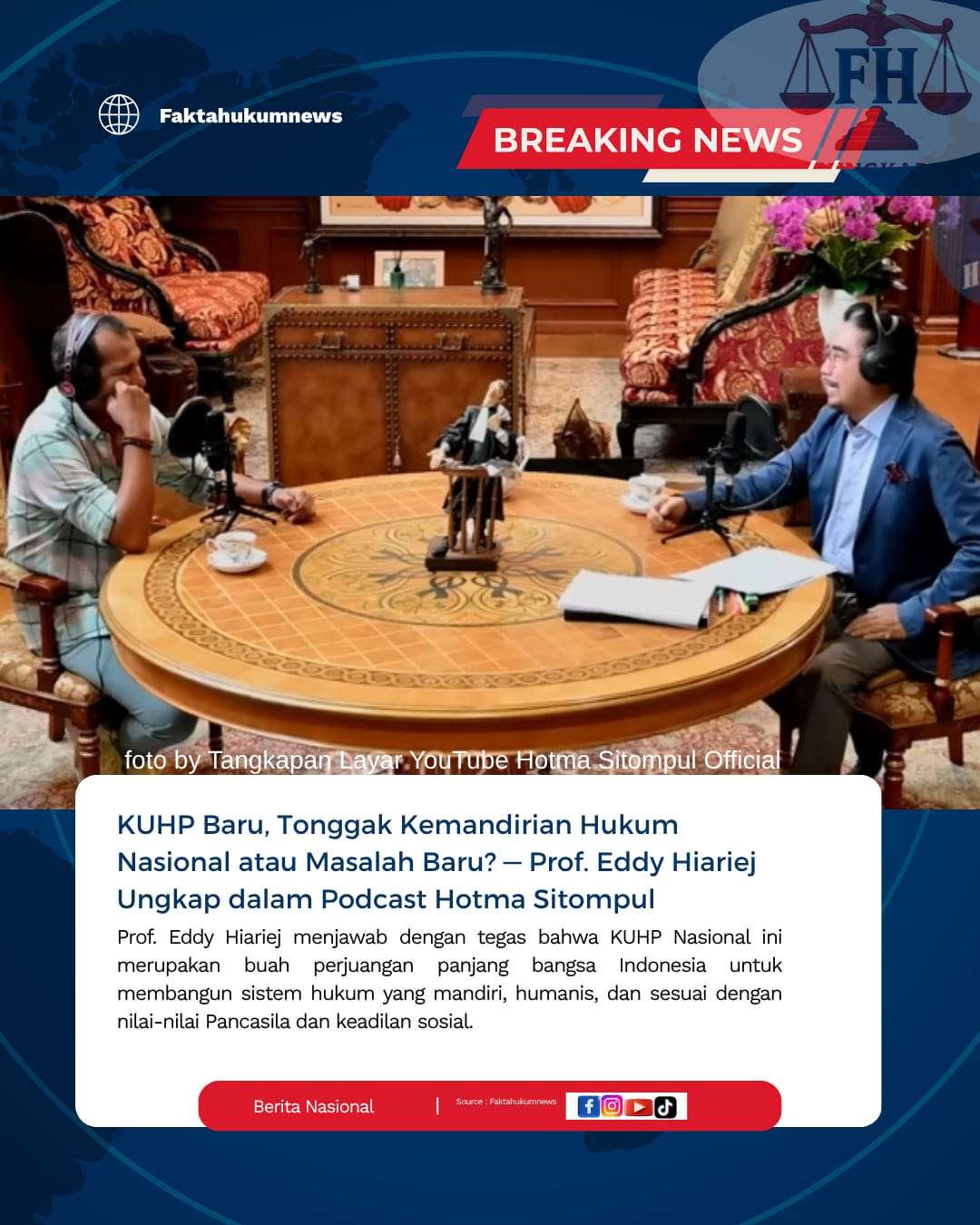 Hotma membuka dialog dengan pertanyaan kritis: “Prof, KUHP Baru ini sudah melalui tujuh rezim dan dua puluh kali pergantian menteri. Apakah ini betul menjadi pembaruan hukum pidana nasional kita, atau justru masalah baru bagi masyarakat?”