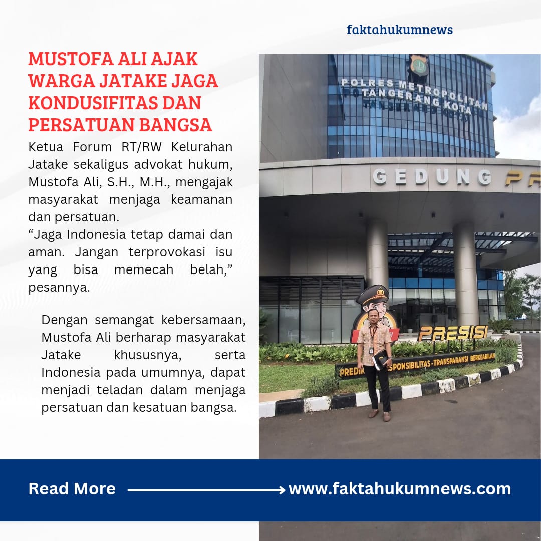 FAKTAHUKUMNEWS, Tangerang – Ketua Forum RT/RW Kelurahan Jatake sekaligus advokat hukum, Mustofa Ali, S.H., M.H., memberikan imbauan penting kepada masyarakat untuk terus menjaga kondusifitas dan persatuan di tengah berbagai dinamika sosial yang berkembang. Selasa, (2/9/2025).