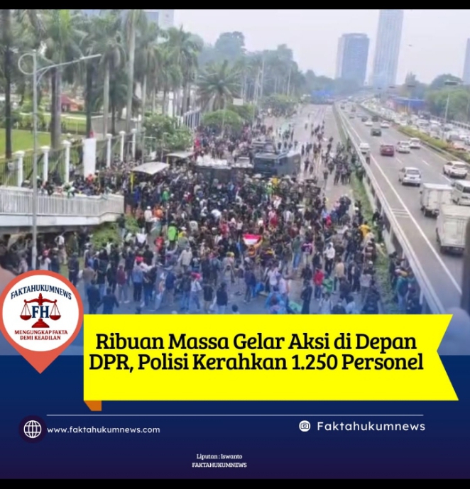 FAKTAHUKUMNEWS, Jakarta – Ribuan massa dari berbagai aliansi masyarakat memadati kawasan depan Gedung MPR/DPR RI, Jakarta, dalam aksi unjuk rasa yang digelar pada Senin (25/8). Sejak pagi hingga menjelang siang, arus lalu lintas di Jalan Gatot Subroto arah Slipi terpaksa ditutup akibat padatnya konsentrasi massa.