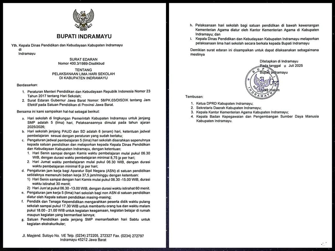Menyikapi itu, Pemkab Indramayu juga menerbitkan Surat Edaran Nomor 400.3/1989/Disdikbud mengenai pelaksanaan sistem lima hari sekolah.
