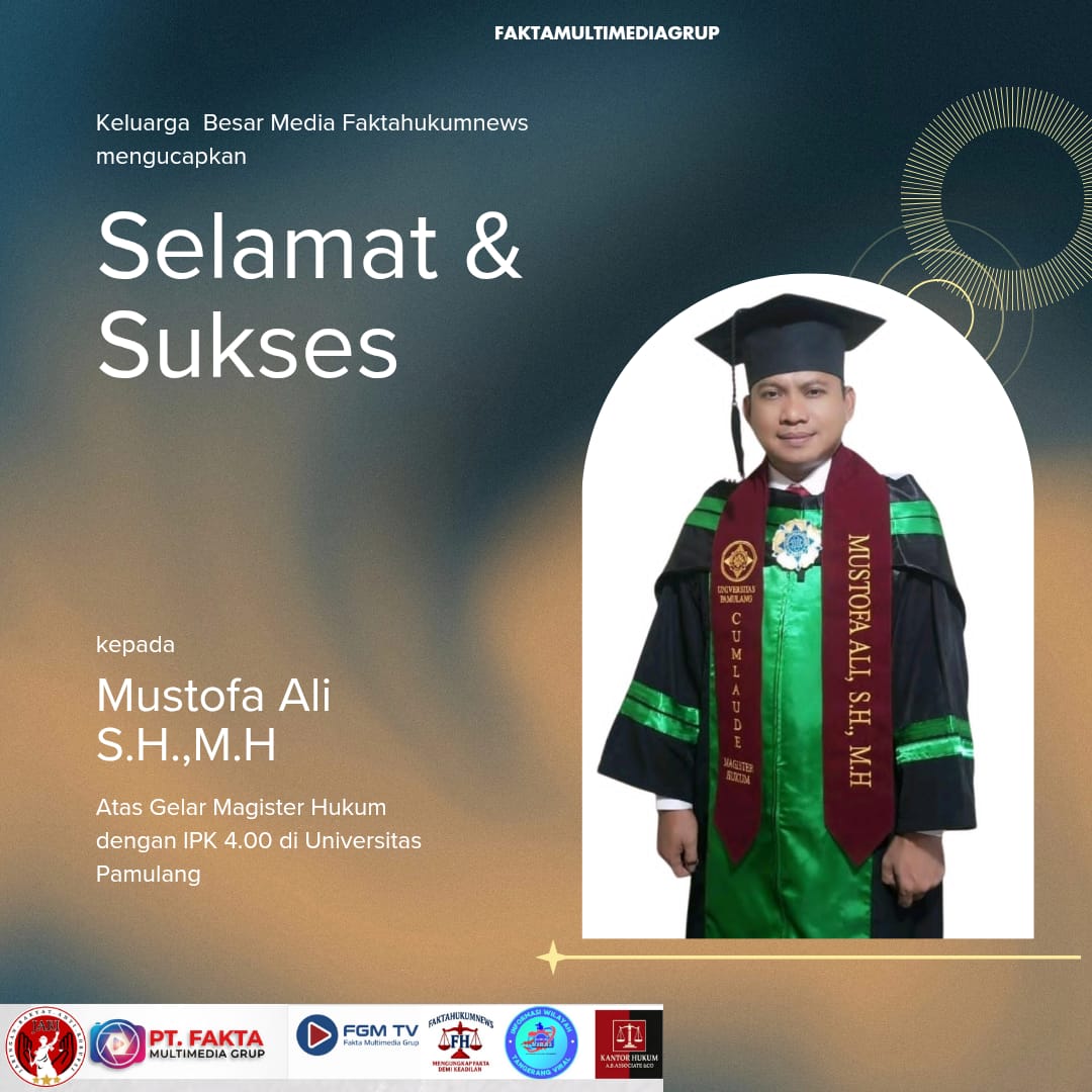 FAKTAHUKUMNEWS, Tangerang – Kabar membanggakan datang dari dunia akademik hukum. Salah satu tokoh muda dan penasehat redaksi Faktahukumnews, Mustofa Ali, S.H., M.H., berhasil meraih Gelar Magister Hukum (M.H.) dari Universitas Pamulang dengan Indeks Prestasi Kumulatif (IPK) sempurna, 4.00.
