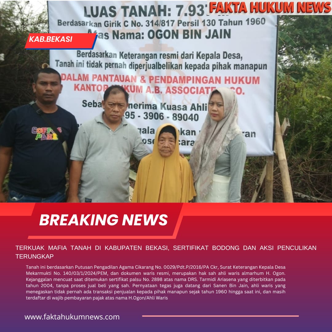 FaktaHukumNews, Bekasi – Sebuah skandal pertanahan kembali mengguncang Kabupaten Bekasi. Fakta-fakta mencengangkan terungkap terkait sebidang tanah seluas 7.397 m² yang berada di Desa Mekarmukti, Kecamatan Cikarang Utara, yang terindikasi kuat menjadi korban praktik mafia tanah.