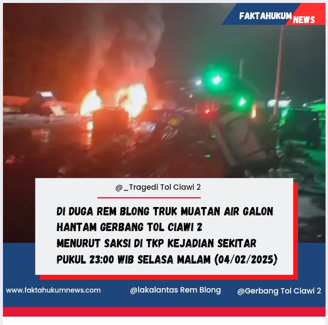 Bogor, faktahukumnews-kecelakaan tragis terjadi di Gerbang Tol Ciawi 2 pada Selasa malam (4/2), sekitar pukul 23:30 WIB. Insiden ini melibatkan sebuah truk bermuatan air galon yang diduga mengalami rem blong, menyebabkan tabrakan beruntun yang merenggut delapan nyawa dan menyebabkan sebelas korban lainnya mengalami luka berat.