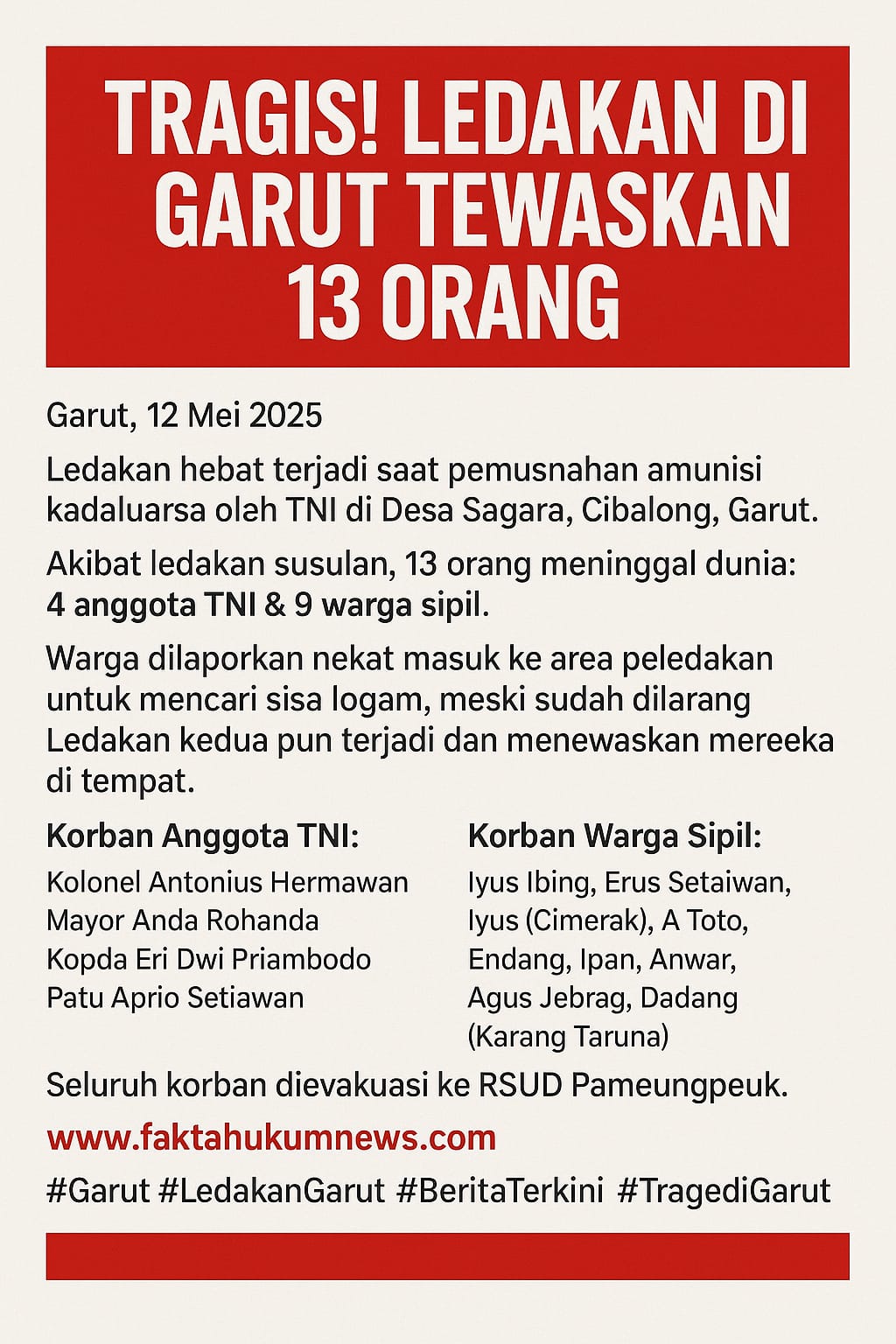 Tragis! Ledakan Saat Pemusnahan Amunisi Kadaluarsa di Garut Tewaskan 13 Orang
